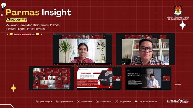 BANDUNG – KPU Kota Bandung mengikuti Kegiatan Parmas Insight Chapter # 8 dengan Tema: “Peran Media Sosial dalam Sosialisai Pilkada (Mengelola Akun Medsos agar engaging dan informatif)” secara daring, Rabu (26/11/2025). Kegiatan ini dihadiri Ketua Divisi Sosialisasi, Pendidikan Pemilih, dan Partisipasi Masyarakat dan SDM bersama Kepala Subbagian Parmas KPU Kabupaten/Kota se-Jawa Barat, turut hadir Ketua Divisi Sosialisasi, Pendidikan Pemilih, dan Partisipasi Masyarakat dan SDM KPU Kota Bandung, Wenti Frihadianti bersama Kepala Sub Bagian Partisipasi, Hubungan Masyarakat dan SDM KPU Kota Bandung beserta jajaran staf.