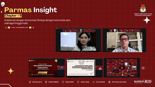BANDUNG – KPU Kota Bandung mengikuti Kegiatan Parmas Insight Chapter #9 dengan Tema: “Kolaborasi dengan Komunitas (Sinergi dengan Komunitas Seni, Olahraga hingga Hobi)” secara daring, Rabu (10/12/2025). Kegiatan ini dihadiri Ketua Divisi Sosialisasi, Pendidikan Pemilih, dan Partisipasi Masyarakat dan SDM bersama Kepala Subbagian Parmas KPU Kabupaten/Kota se-Jawa Barat, turut hadir Ketua Divisi Sosialisasi, Pendidikan Pemilih, dan Partisipasi Masyarakat dan SDM KPU Kota Bandung, Wenti Frihadianti bersama Kepala Sub Bagian Partisipasi, Hubungan Masyarakat dan SDM KPU Kota Bandung beserta jajaran staf.