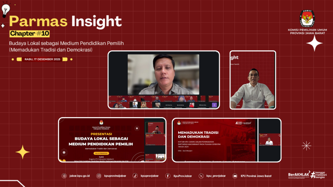 BANDUNG – KPU Kota Bandung mengikuti Kegiatan Parmas Insight Chapter #10 dengan Tema: “Budaya lokal sebagai Medium Pendidikan Pemilih (Memadukan Tradisi dan Demokrasi) secara daring, Rabu (17/12/2025). Kegiatan ini dihadiri Ketua Divisi Sosialisasi, Pendidikan Pemilih, dan Partisipasi Masyarakat dan SDM bersama Kepala Subbagian Parmas KPU Kabupaten/Kota se-Jawa Barat, turut hadir Ketua Divisi Sosialisasi, Pendidikan Pemilih, dan Partisipasi Masyarakat dan SDM KPU Kota Bandung, Wenti Frihadianti bersama jajaran staf.