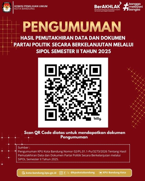 Berdasarkan hasil verfikasi terhadap data dan dokumen pemutakhiran Partai Politik, dengan ini disampaikan hasil pemutakhiran data dan dokumen Partai Politik secara berkelanjutan melalui Silpol Semester II Tahun 2025, dapat di unduh DISINI