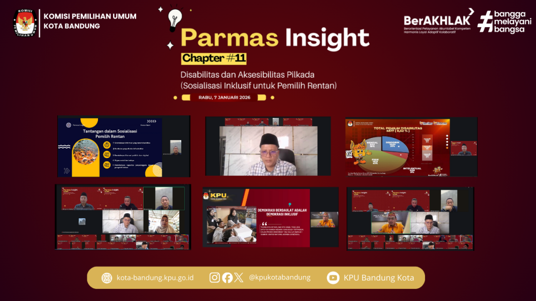 BANDUNG – KPU Kota Bandung mengikuti Kegiatan Parmas Insight Chapter #11 dengan Tema: “Disabilitas dan Aksesibilitas Pilkada (Sosialisasi inklusif untuk pemilih rentan) secara daring, Rabu (7/1/2026). Kegiatan ini dihadiri Ketua Divisi Sosialisasi, Pendidikan Pemilih, dan Partisipasi Masyarakat dan SDM bersama Kepala Subbagian Parmas KPU Kabupaten/Kota se-Jawa Barat, turut hadir Ketua Divisi Sosialisasi, Pendidikan Pemilih, dan Partisipasi Masyarakat dan SDM KPU Kota Bandung, Wenti Frihadianti bersama jajaran staf.