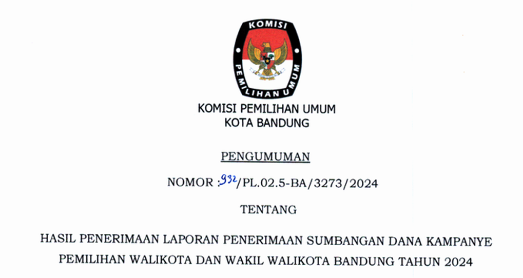 Berdasarkan Tanda Terima dan Berita Acara Penerimaan Laporan Penerimaan Sumbangan Dana Kampanye (LPSDK) dari pasangan calon Wali Kota dan Wakil Wali Kota Bandung Tahun 2024, KPU Kota Bandung dengan ini menyampaikan hasil penerimaan LPSDK yang telah diterima. Adapun laporan ini memuat rincian jumlah sumbangan yang diterima masing-masing pasangan calon sebagai bagian dari komitmen transparansi dan akuntabilitas dalam proses kampanye. Kami sampaikan hasil penerimaan LPSDK secara lengkap yang dapat diunduh melalui tautan berikut: