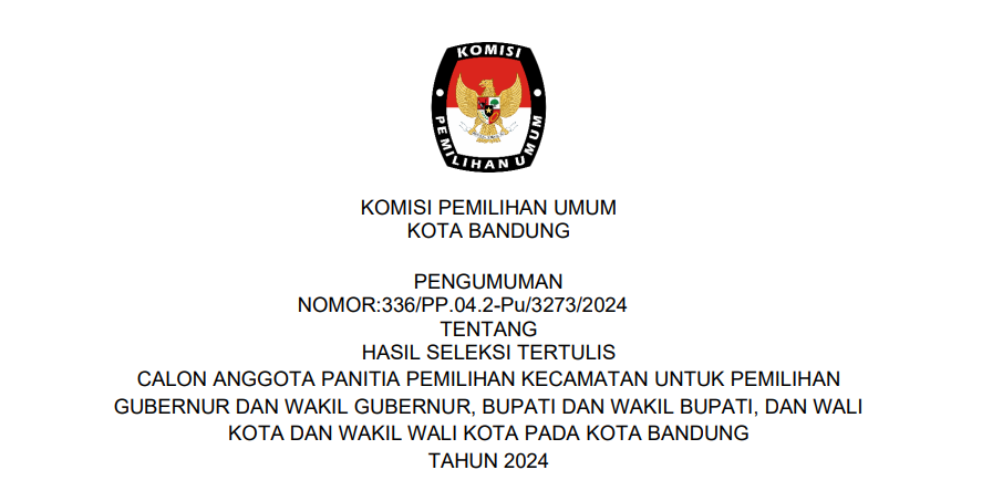 Sehubungan dengan Komisi Pemilihan Umum Kota Bandung telah melaksanakan tahapan Seleksi Tertulis Calon Anggota Panitia Pemilihan Kecamatan pada untuk Pemilihan Gubernur dan Wakil Gubernur, Bupati dan Wakil Bupati, dan Wali Kota dan Wakil Wali Kota Tahun 2024, disampaikan beberapa hal sebagai berikut: