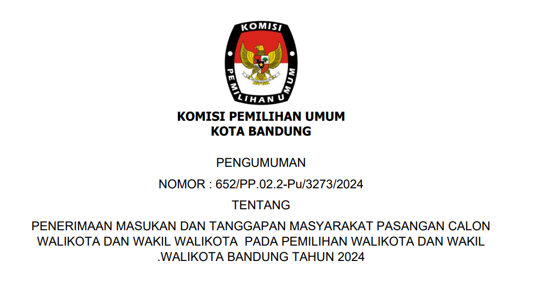Dalam rangka melaksanakan ketentuan Pasal 137 Peraturan KPU Nomor 8 Tahun 2024 tentang Pencalonan Gubernur dan Wakil Gubernur, Bupati dan Wakil Bupati, serta Walikota dan Wakil Walikota, yang telah diubah dengan Peraturan KPU Nomor 10 Tahun 2024, Komisi Pemilihan Umum Kota Bandung dengan ini mengumumkan Penerimaan Masukan dan Tanggapan Masyarakat terhadap Pasangan Calon Walikota dan Wakil Walikota Bandung Tahun 2024.