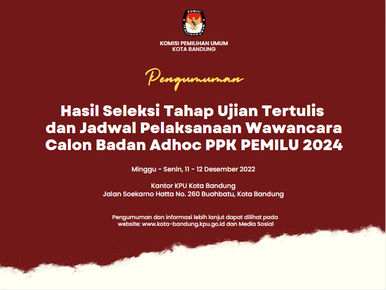 Kami ucapkan Selamat dan Sukses untuk selanjutnya mengikuti proses Tahap Seleksi Wawancara yang akan dilaksanakan pada hari Minggu - Senin tanggal 11 - 12 Desember 2022 bertempat di Kantor KPU Kota Bandung.