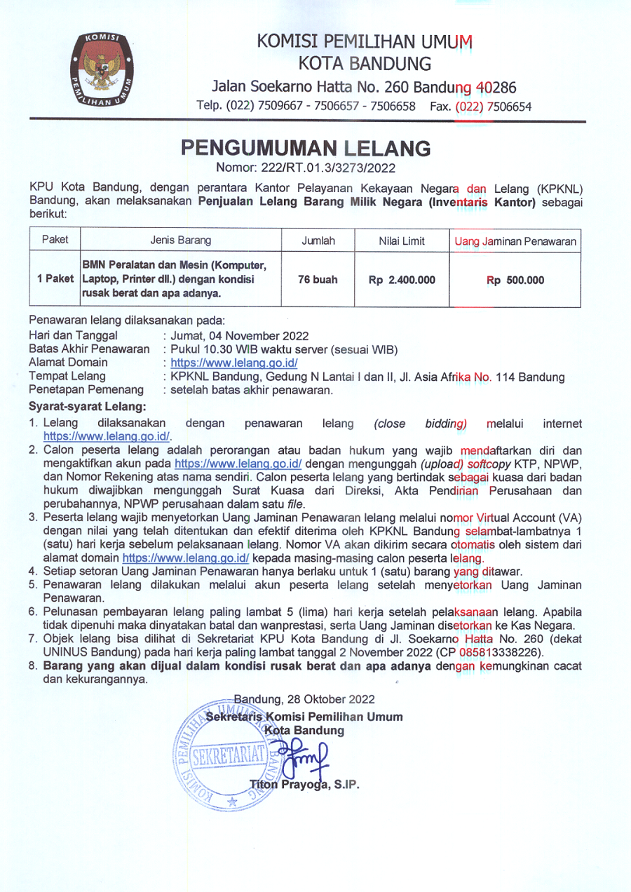 PENGUMUMAN LELANG BARANG MILIK NEGARA (INVENTARIS KANTOR) KPU KOTA BANDUNG