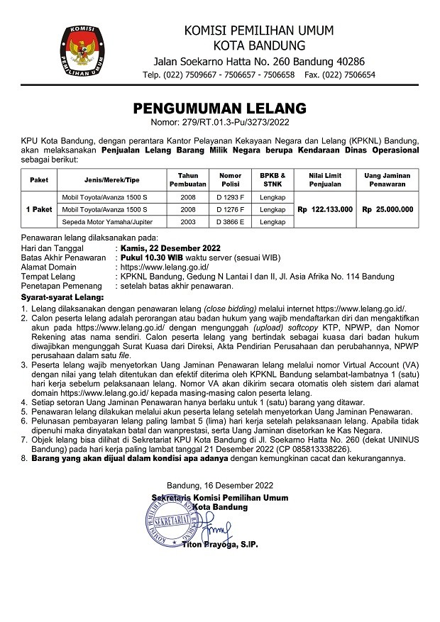 KPU Kota Bandung, dengan perantara Kantor Pelayanan Kekayaan Negara dan Lelang (KPKNL) Bandung, akan melaksanakan Penjualan Lelang Barang Milik Negara berupa Kendaraan Dinas Operasional.
