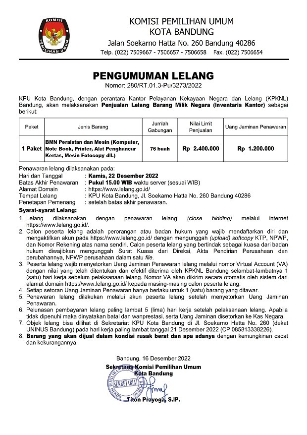 KPU Kota Bandung, dengan perantara Kantor Pelayanan Kekayaan Negara dan Lelang (KPKNL) Bandung, akan melaksanakan Penjualan Lelang Barang Milik Negara (Inventaris Kantor)