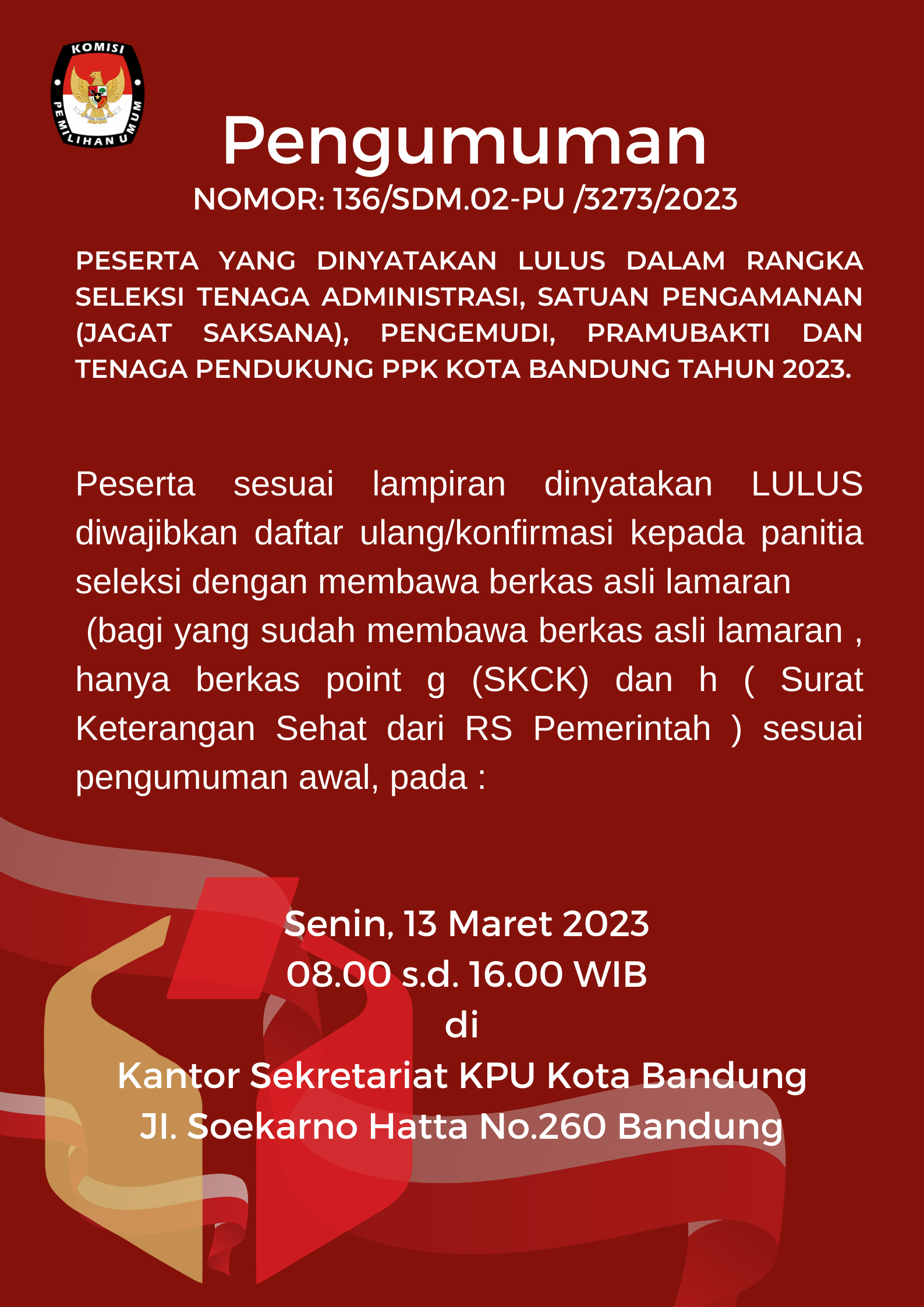 Berdasarkan hasil Seleksi Tenaga Administrasi, Satuan Pengamanan (Jagat Saksana), Pengemudi, Pramubakti dan Tenaga Pendukung PPK pada Sekretariat KPU Kota Bandung, diumumkan bahwa peserta sesuai lampiran dinyatakan LULUS dan diwajibkan daftar ulang/konfirmasi kepada panitia seleksi dengan membawa berkas asli lamaran ( bagi yang sudah membawa berkas asli lamaran , hanya berkas point g (SKCK) dan h ( Surat Keterangan Sehat dari RS Pemerintah ) sesuai pengumuman awal, pada :