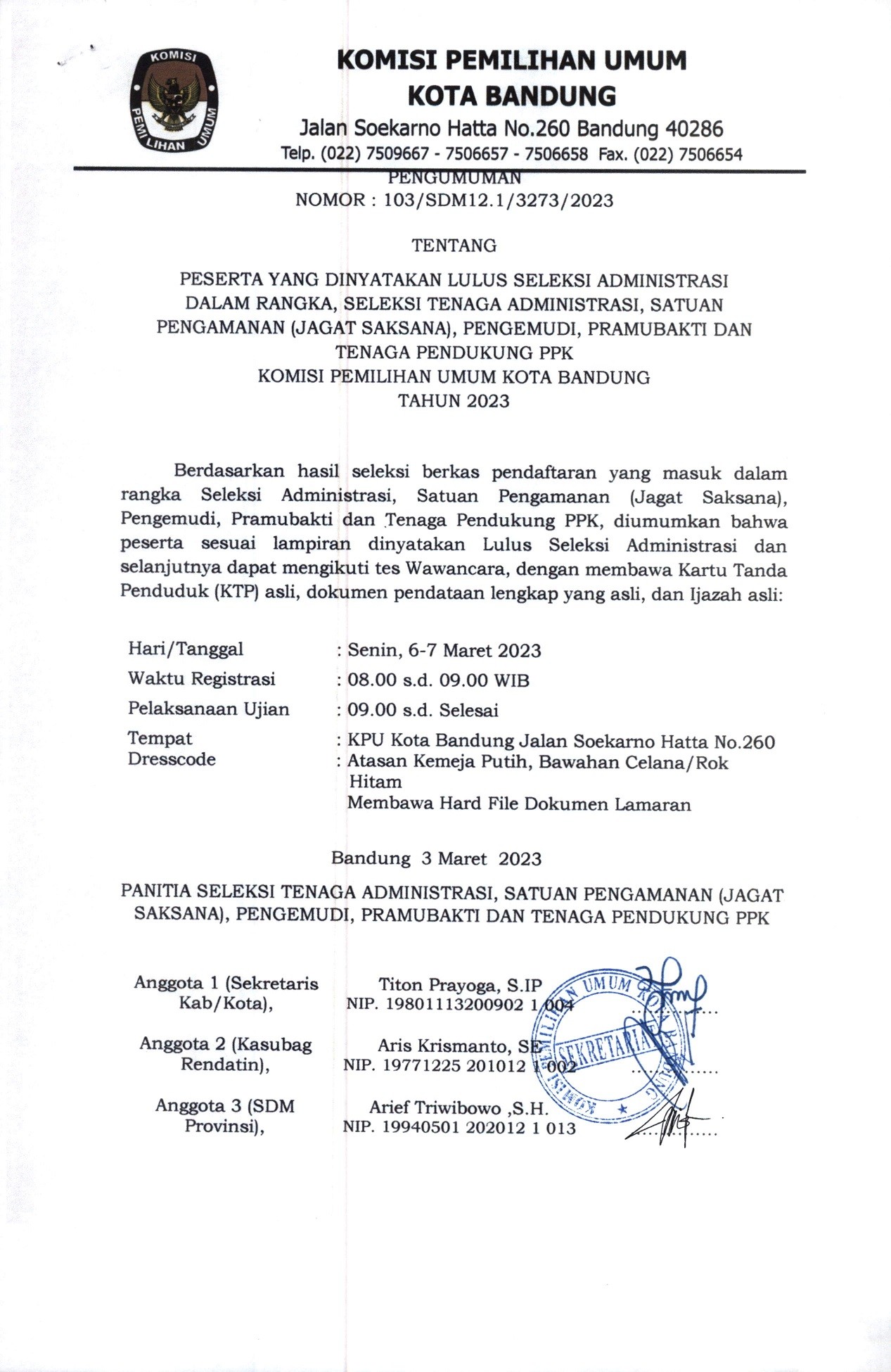 Berdasarkan hasil seleksi berkas pendaftaran yang masuk, dalam rangka seleksai administrasi, satuan pengamanan (jagat saksana), pengemudi, pramubakti, dan tenaga pendukung PPK, diumumkan bahwa peserta sesuai lampairan dinyatakan LULUS SELEKSI ADMINISTRASI dan selanjutnya dapat mengikuti tes wawancara dengan membawa Kartu Tanda Penduduk (KTP) asli, dokumen pendataan lengkap asli dan ijazah asli.