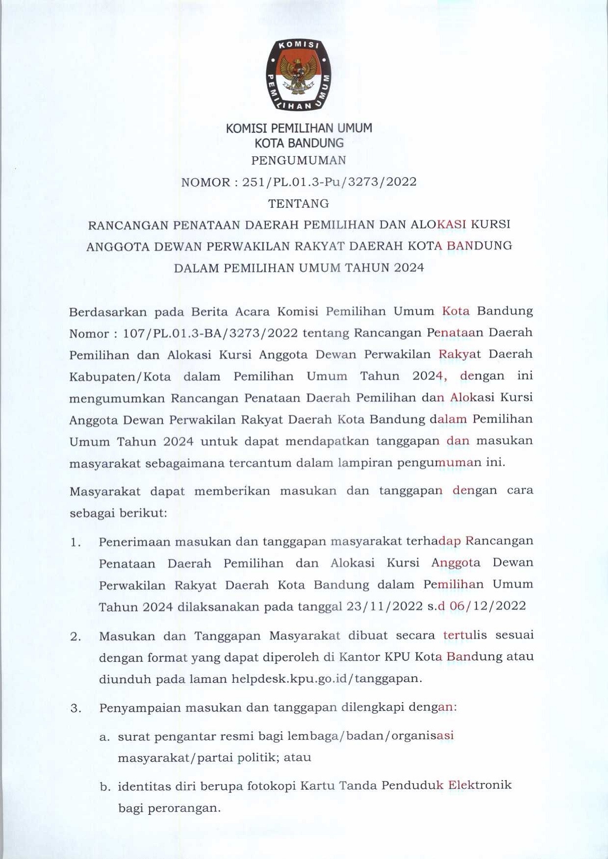 Berdasarkan pada Berita Acara Komisi Pemilihan Umum Kota Bandung Nomor : 107/PL.01.3-BA/3273/2022 tentang Rancangan Penataan Daerah Pemilihan dan Alokasi Kursi Anggota Dewan Perwakilan Rakyat Daerah Kabupaten/Kota dalam Pemilihan Umum Tahun 2024, dengan ini mengumumkan Rancangan Penataan Daerah Pemilihan dan Alokasi Kursi Anggota Dewan Perwakilan Rakyat Daerah Kota Bandung dalam Pemilihan Umum Tahun 2024 untuk dapat mendapatkan tanggapan dan masukan masyarakat sebagaimana tercantum dalam lampiran pengumuman ini.