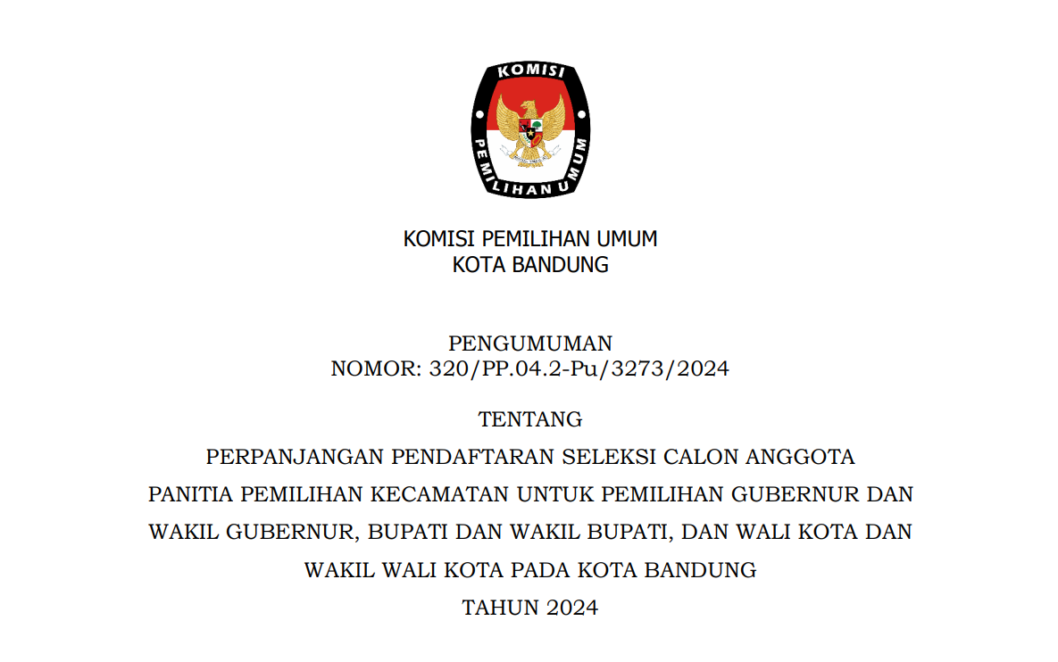 PERPANJANGAN PENDAFTARAN SELEKSI CALON ANGGOTA PANITIA PEMILIHAN KECAMATAN UNTUK PEMILIHAN WALI KOTA DAN WAKIL WALI KOTA PADA KOTA BANDUNG TAHUN 2024