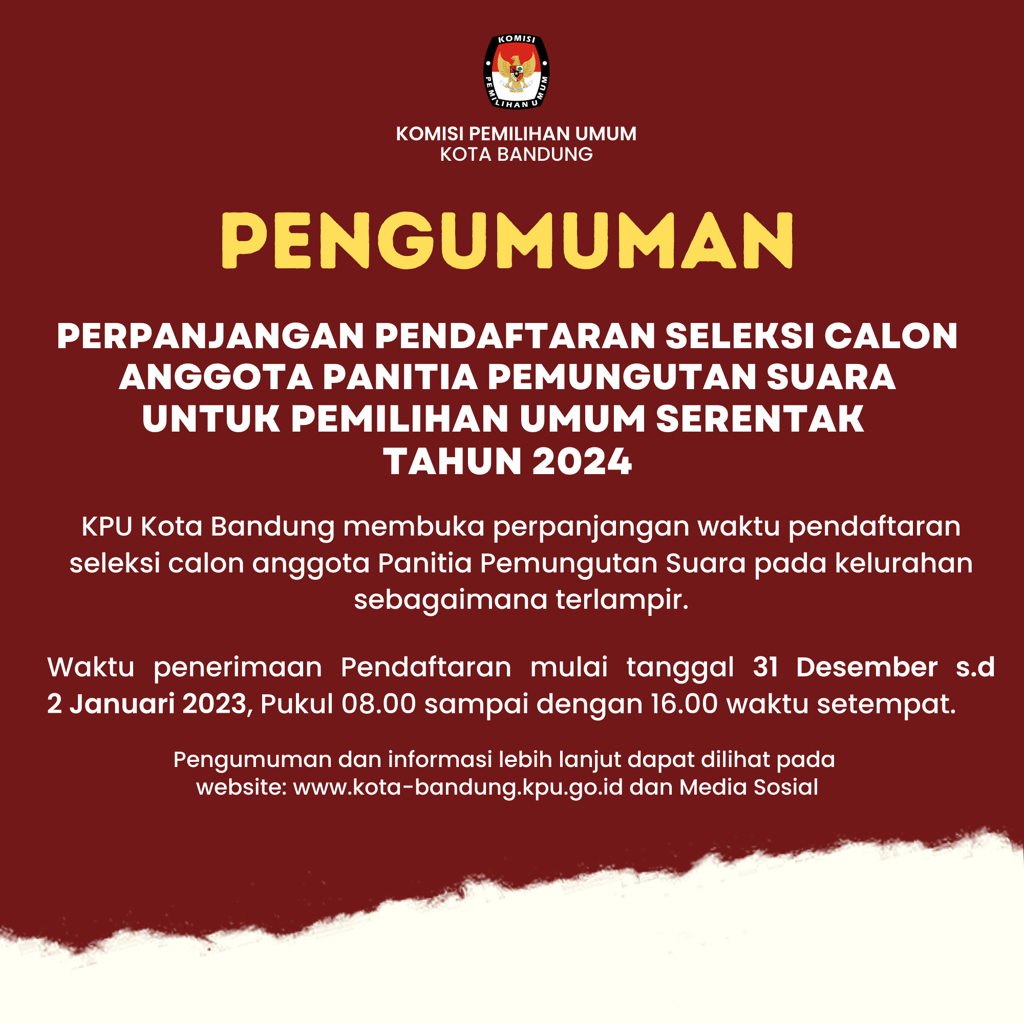 Sehubungan dengan hal tersebut, KPU Kota Bandung membuka perpanjangan waktu pendaftaran seleksi calon anggota Panitia Pemungutan Suara pada kelurahan sebagai sebagaimana terlampir pada menu download dibawah ini