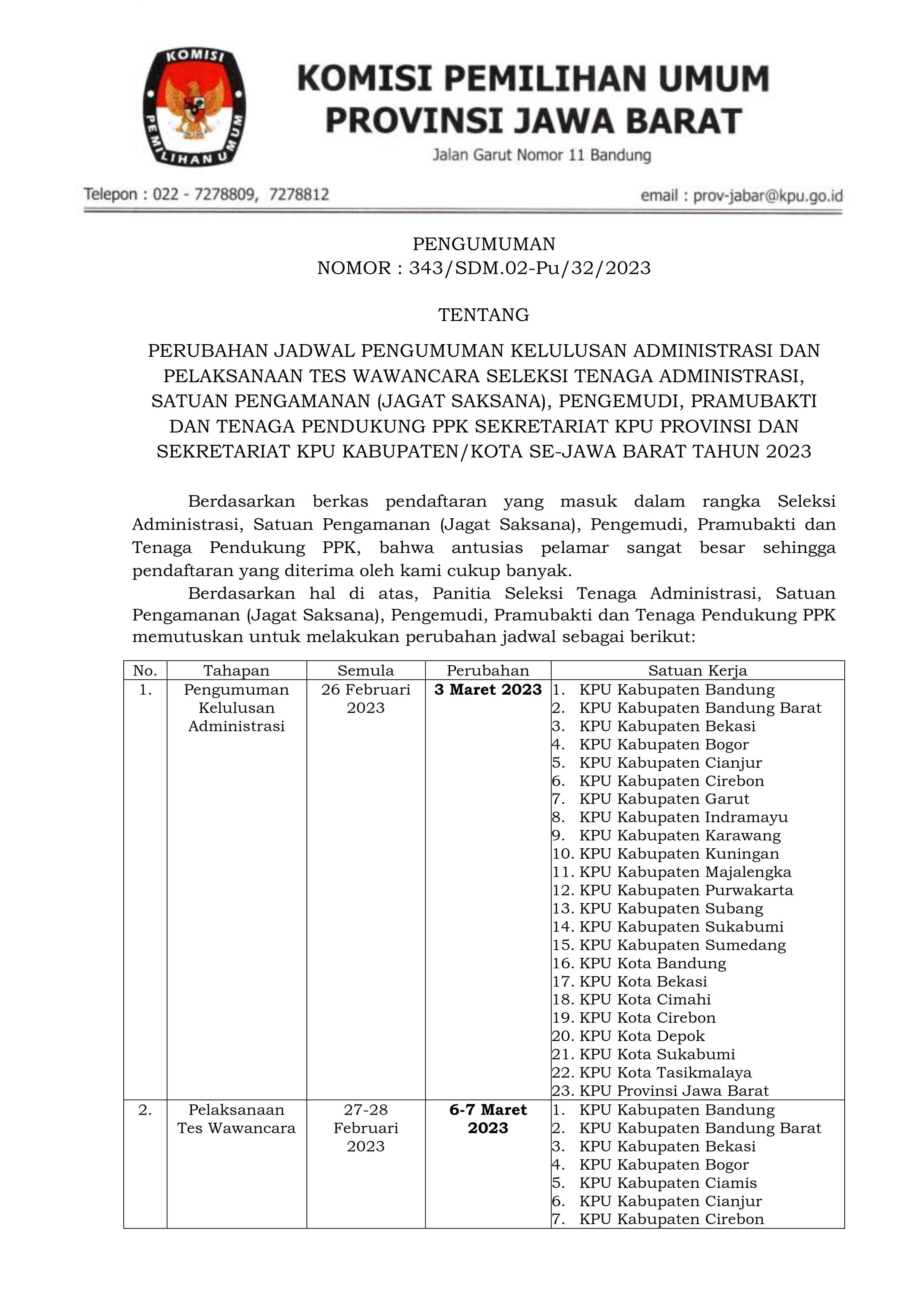 PERUBAHAN JADWAL PENGUMUMAN KELULUSAN ADMINISTRASI DAN PELAKSANAAN TES WAWANCARA SELEKSI TENAGA ADMINISTRASI, SATUAN PENGAMANAN (JAGAT SAKSANA), PENGEMUDI, PRAMUBAKTI DAN TENAGA PENDUKUNG PPK SEKRETARIAT KPU PROVINSI DAN SEKRETARIAT KPU KABUPATEN/KOTA SE-JAWA BARAT TAHUN 2023