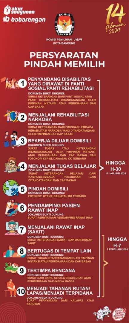 Sampurasun! #TemanPemilih Kota Bandung yang hendak melakukan pindah memilih, perhatikan informasi berikut dengan cermat. Proses pindah memilih harus diurus sesuai persyaratan yang berlaku.