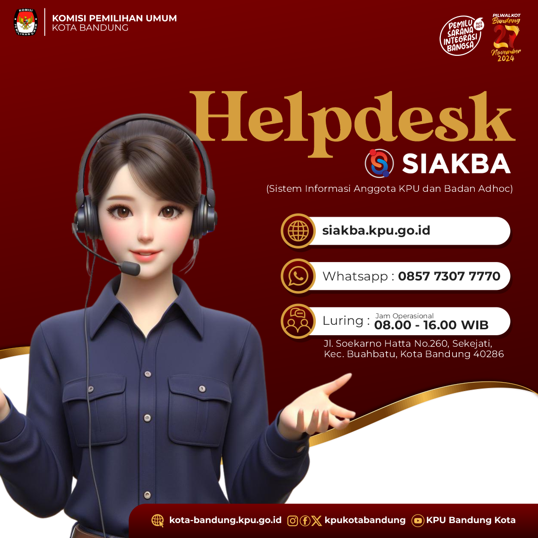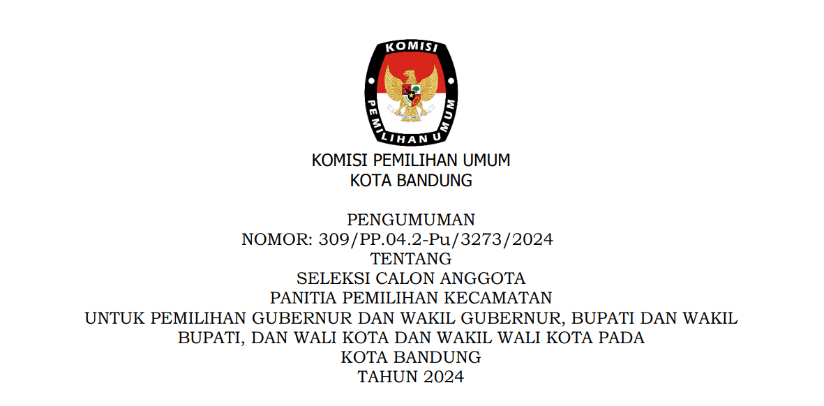 Dalam rangka pembentukan Calon Anggota Panitia Pemilihan Kecamatan untuk Pemilihan Gubernur dan Wakil Gubernur, Bupati dan Wakil Bupati, dan Wali Kota dan Wakil Wali Kota Tahun 2024, Komisi Pemilihan Umum Kota Bandung mengundang Warga Negara Indonesia yang memenuhi kualifikasi untuk mendaftarkan diri menjadi Panitia Pemilihan Kecamatan untuk Pemilihan Gubernur dan Wakil Gubernur, Bupati dan Wakil Bupati, dan Wali Kota dan Wakil Wali Kota dengan ketentuan selengkapnya: UNDUH DISINI