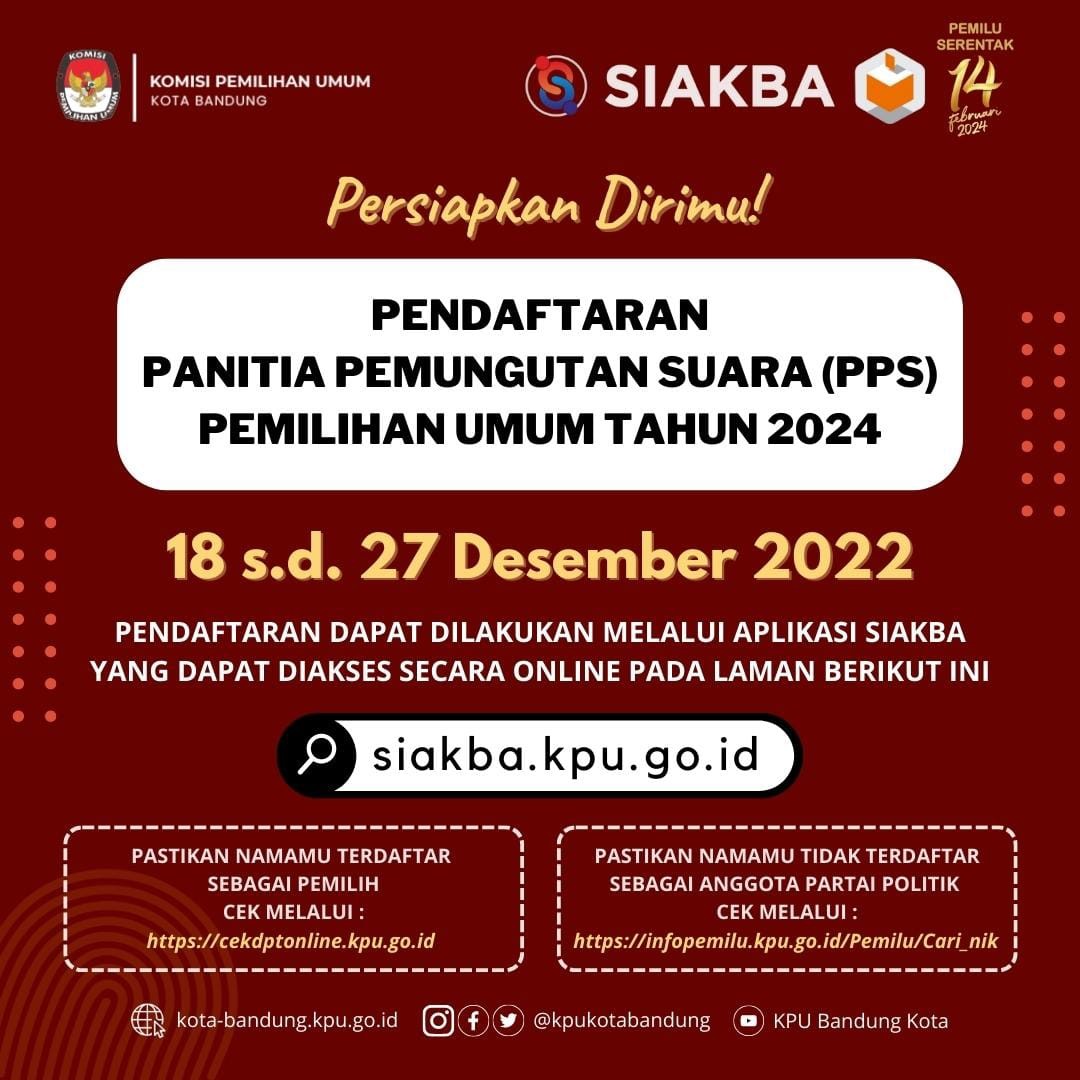 Dalam rangka pembentukan Panitia Pemungutan Suara untuk Pemilihan Umum, Komisi Pemilihan Umum Kota Bandung mengundang Warga Negara Indonesia yang memenuhi persyaratan untuk mendaftarkan diri menjadi anggota Panitia Pemungutan Suara / PPS