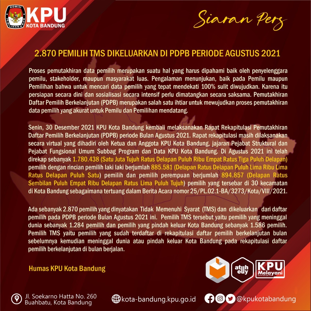 Ada sebanyak 2.870 pemilih dinyatakan Tidak Memenuhi Syarat (TMS) dan dikeluarkan dari daftar pemilih pada PDPB periode Bulan Angustus 2021 ini. Pemilih TMS tersebut yaitu pemilih yang meninggal dunia sebanyak 1.284 pemilih dan pemilih yang pindah keluar Kota Bandung sebanyak 1.586 pemilih. Pemilih TMS yaitu pemilih yang sudah terdaftar di rekapitulasi daftar pemilih berkelanjutan bulan sebelumnya kemudian meninggal dunia atau pindah keluar Kota Bandung pada rekapitulasi daftar pemilih berkelanjutan di bulan berjalan.