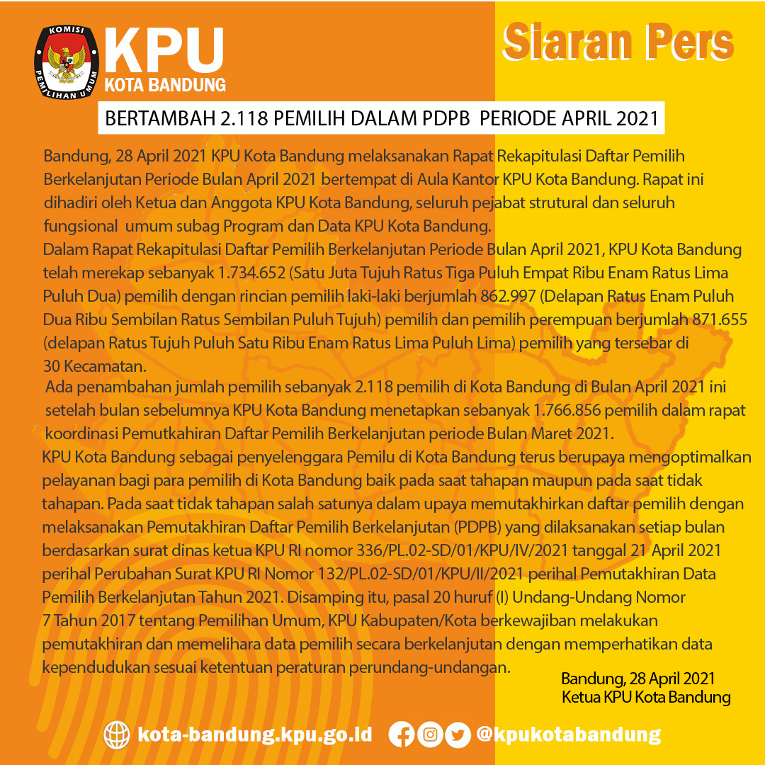 KPU Kota Bandung sebagai penyelenggara Pemilu di Kota Bandung terus berupaya mengoptimalkan pelayanan bagi para pemilih di Kota Bandung baik pada saat tahapan maupun pada saat tidak tahapan. Pada saat tidak tahapan salah satunya dalam upaya memutakhirkan daftar pemilih dengan melaksanakan Pemutakhiran Daftar Pemilih Berkelanjutan (PDPB) yang dilaksanakan setiap bulan berdasarkan surat dinas ketua KPU RI nomor 336/PL.02-SD/01/KPU/IV/2021 tanggal 21 April 2021 perihal Perubahan Surat KPU RI Nomor 132/PL.02-SD/01/KPU/II/2021 perihal Pemutakhiran Data Pemilih Berkelanjutan Tahun 2021. Disamping itu, pasal 20 huruf (I) Undang-Undang Nomor 7 Tahun 2017 tentang Pemilihan Umum, KPU Kabupaten/Kota berkewajiban melakukan pemutakhiran dan memelihara data pemilih secara berkelanjutan dengan memperhatikan data kependudukan sesuai ketentuan peraturan perundang-undangan.
