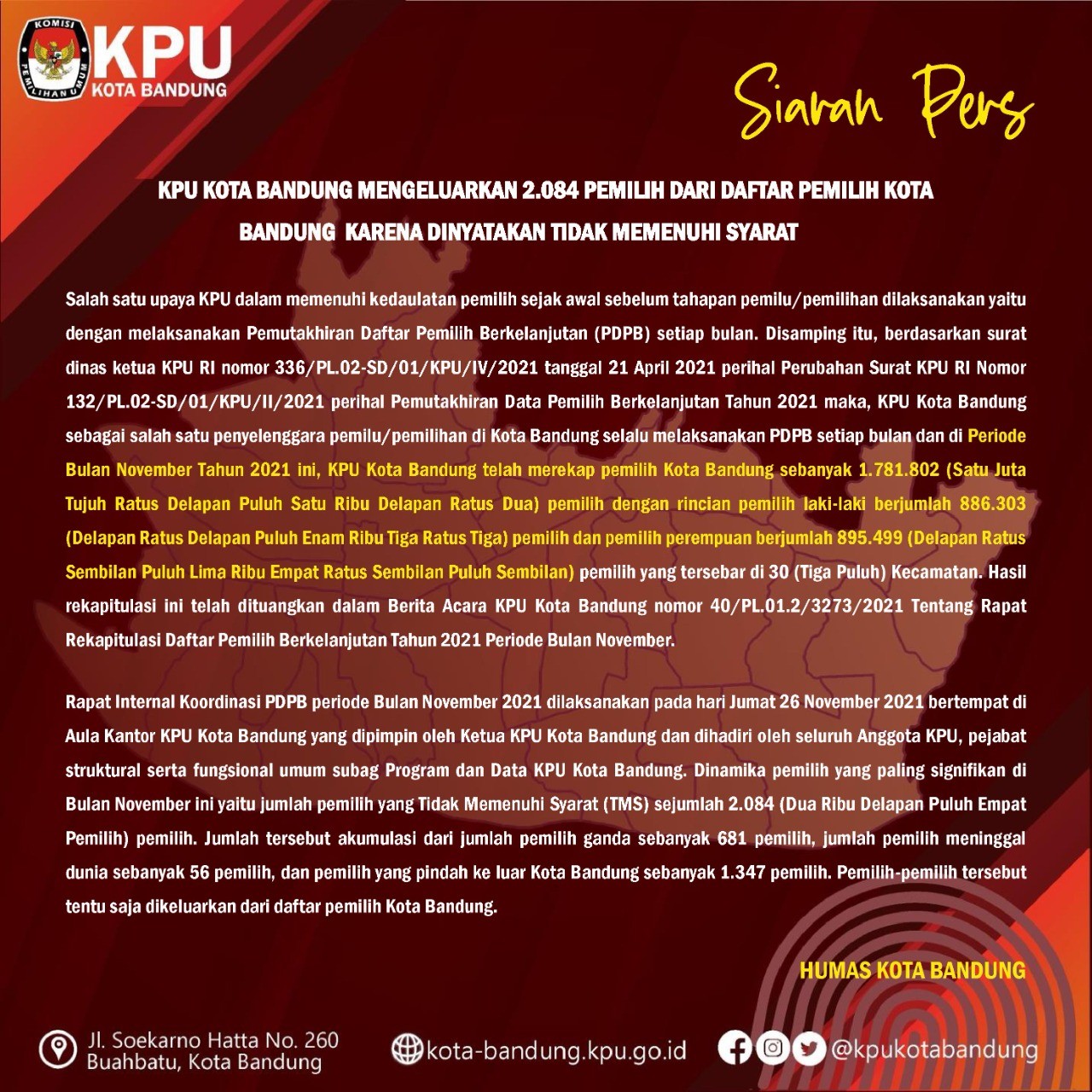 Rapat Internal Koordinasi PDPB periode Bulan November 2021 dilaksanakan KPU Kota Bandung pada Jumat 26 November 2021 bertempat di Aula Kantor KPU Kota Bandung yang dipimpin oleh Ketua KPU Kota Bandung dan dihadiri oleh seluruh Anggota KPU, pejabat struktural serta fungsional umum subag Program dan Data KPU Kota Bandung. Dinamika pemilih yang paling signifikan di Bulan November ini yaitu jumlah pemilih yang Tidak Memenuhi Syarat (TMS) sejumlah 2.084 (Dua Ribu Delapan Puluh Empat Pemilih) pemilih. Jumlah tersebut akumulasi dari jumlah pemilih ganda sebanyak 681 pemilih, jumlah pemilih meninggal dunia sebanyak 56 pemilih, dan pemilih yang pindah ke luar Kota Bandung sebanyak 1.347 pemilih. Pemilih-pemilih tersebut tentu saja dikeluarkan dari daftar pemilih Kota Bandung.