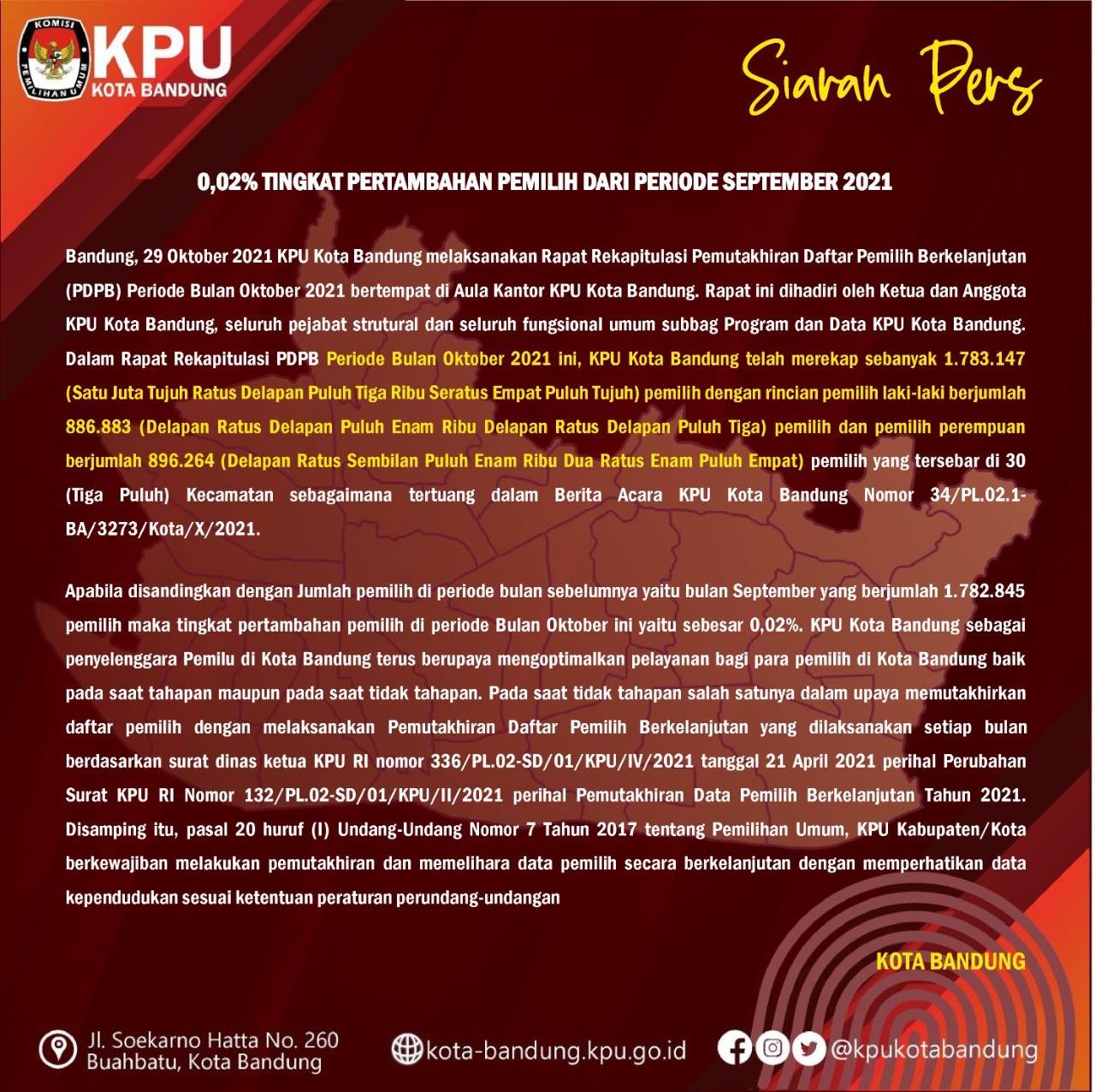Apabila disandingkan dengan Jumlah pemilih di periode bulan sebelumnya yaitu bulan September yang berjumlah 1.782.845 pemilih maka tingkat pertambahan pemilih di periode Bulan Oktober ini yaitu sebesar 0,02%. KPU Kota Bandung sebagai penyelenggara Pemilu di Kota Bandung terus berupaya mengoptimalkan pelayanan bagi para pemilih di Kota Bandung baik pada saat tahapan maupun pada saat tidak tahapan. Pada saat tidak tahapan salah satunya dalam upaya memutakhirkan daftar pemilih dengan melaksanakan Pemutakhiran Daftar Pemilih Berkelanjutan yang dilaksanakan setiap bulan berdasarkan surat dinas ketua KPU RI nomor 336/PL.02-SD/01/KPU/IV/2021 tanggal 21 April 2021 perihal Perubahan Surat KPU RI Nomor 132/PL.02-SD/01/KPU/II/2021 perihal Pemutakhiran Data Pemilih Berkelanjutan Tahun 2021. Disamping itu, pasal 20 huruf (I) Undang-Undang Nomor 7 Tahun 2017 tentang Pemilihan Umum, KPU Kabupaten/Kota berkewajiban melakukan pemutakhiran dan memelihara data pemilih secara berkelanjutan dengan memperhatikan data kependudukan sesuai ketentuan peraturan perundang-undangan.