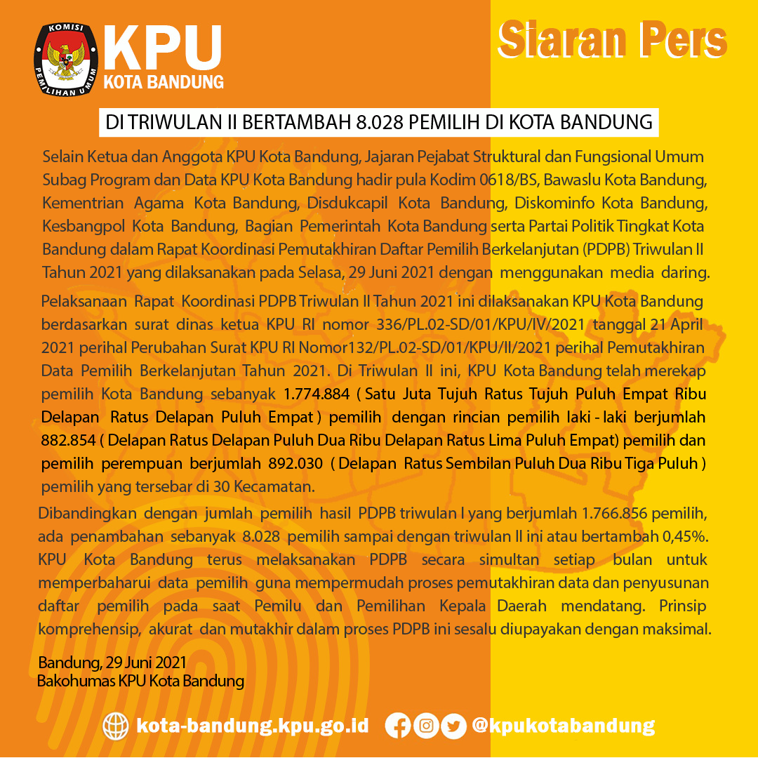 Pelaksanaan Rapat Koordinasi PDPB Triwulan II Tahun 2021 ini dilaksanakan KPU Kota Bandung berdasarkan surat dinas ketua KPU RI nomor 336/PL.02-SD/01/KPU/IV/2021 tanggal 21 April 2021 perihal Perubahan Surat KPU RI Nomor 132/PL.02-SD/01/KPU/II/2021 perihal Pemutakhiran Data Pemilih Berkelanjutan Tahun 2021. Di Triwulan II ini, KPU Kota Bandung telah merekap pemilih Kota Bandung sebanyak 1.774.884 (Satu Juta Tujuh Ratus Tujuh Puluh Empat Ribu Delapan Ratus Delapan Puluh Empat) pemilih dengan rincian pemilih laki-laki berjumlah 882.854 (Delapan Ratus Delapan Puluh Dua Ribu Delapan Ratus Lima Puluh Empat) pemilih dan pemilih perempuan berjumlah 892.030 (Delapan Ratus Sembilan Puluh Dua Ribu Tiga Puluh) pemilih yang tersebar di 30 Kecamatan.