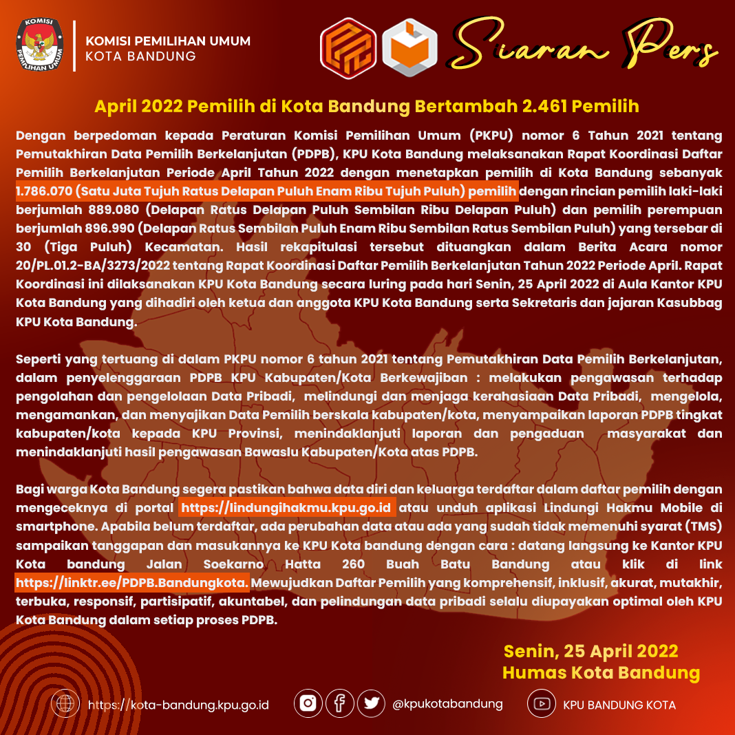 Dengan berpedoman kepada Peraturan Komisi Pemilihan Umum (PKPU) nomor 6 Tahun 2021 tentang Pemutakhiran Data Pemilih Berkelanjutan (PDPB), KPU Kota Bandung melaksanakan Rapat Koordinasi Daftar Pemilih Berkelanjutan Periode April Tahun 2022 dengan menetapkan pemilih di Kota Bandung sebanyak 1.786.070 (Satu Juta Tujuh Ratus Delapan Puluh Enam Ribu Tujuh Puluh) pemilih dengan rincian pemilih laki-laki berjumlah 889.080 (Delapan Ratus Delapan Puluh Sembilan Ribu Delapan Puluh) dan pemilih perempuan berjumlah 896.990 (Delapan Ratus Sembilan Puluh Enam Ribu Sembilan Ratus Sembilan Puluh) yang tersebar di 30 (Tiga Puluh) Kecamatan. Hasil rekapitulasi tersebut dituangkan dalam Berita Acara nomor 20/PL.01.2-BA/3273/2022 tentang Rapat Koordinasi Daftar Pemilih Berkelanjutan Tahun 2022 Periode April. Rapat Koordinasi ini dilaksanakan KPU Kota Bandung secara luring pada hari Senin, 25 April 2022 di Aula Kantor KPU Kota Bandung yang dihadiri oleh ketua dan anggota KPU Kota Bandung serta Sekretaris dan jajaran Kasubbag KPU Kota Bandung.