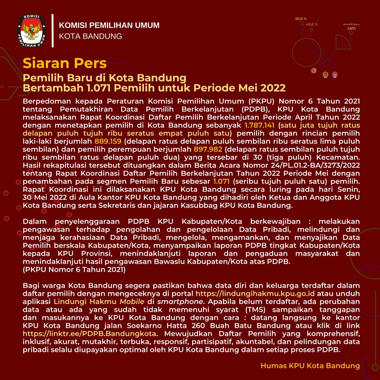 Berpedoman kepada Peraturan Komisi Pemilihan Umum (PKPU) Nomor 6 Tahun 2021 tentang Pemutakhiran Data Pemilih Berkelanjutan (PDPB), KPU Kota Bandung melaksanakan Rapat Koordinasi Daftar Pemilih Bekelanjutan Mei Tahun 2022 dengan menetapkan pemilih di Kota Bandung sebanyak 1.787.141 (Satu juta tujuh ratus tujuh puluh ribu seratus empat puluh satu) pemilih dengan rincian pemilih laki-laki berjumlah 889.159 (Delapan ratus delapan puluh sembilan ribu seratus lima puluh sembilan) dan pemilih perempuan berjumlah 897.982 (Delapan ratus sembilan puluh tujuh ribu sembilan ratus delapan puluh dua) yang tersebar di 30 (tiga puluh) kecamatan. Hasil rekapitulasi tersebut dituangkan dalam Berita Acara nomor 24/PL.01.2-BA/3273/2022 tentang Rapat Koordinasi Daftar Pemilih Berkelanjutan Tahun 2022 Periode Mei dengan penambahan pada segmen Pemilih Baru sebesar 1.071 (Seribu tujuh puluh satu). Rapat Koordinasi ini dilaksanakan KPU Kota Bandung secara luring pada hari Senin, 30 Mei 2022 di Aula Kantor KPU Kota Bandung yang dihadiri oleh ketua dan anggota KPU Kota Bandung serta Sekretaris dan jajaran Kasubbag KPU Kota Bandung.