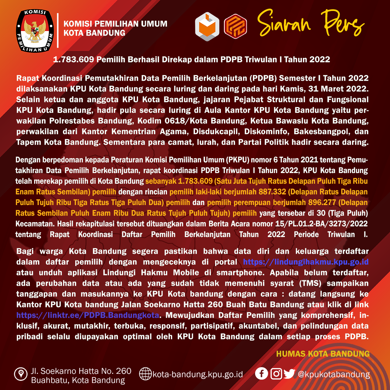 Dengan berpedoman kepada Peraturan Komisi Pemilihan Umum (PKPU) nomor 6 Tahun 2021 tentang Pemutakhiran Data Pemilih Berkelanjutan, rapat koordinasi PDPB Triwulan I Tahun 2022, KPU Kota Bandung telah merekap pemilih di Kota Bandung sebanyak 1.783.609 (Satu Juta Tujuh Ratus Delapan Puluh Tiga Ribu Enam Ratus Sembilan) pemilih dengan rincian pemilih laki-laki berjumlah 887.332 (Delapan Ratus Delapan Puluh Tujuh Ribu Tiga Ratus Tiga Puluh Dua) pemilih dan pemilih perempuan berjumlah 896.277 (Delapan Ratus Sembilan Puluh Enam Ribu Dua Ratus Tujuh Puluh Tujuh) pemilih yang tersebar di 30 (Tiga Puluh) Kecamatan. Hasil rekapitulasi tersebut dituangkan dalam Berita Acara nomor 15/PL.01.2-BA/3273/2022 tentang Rapat Koordinasi Daftar Pemilih Berkelanjutan Tahun 2022 Periode Triwulan I.