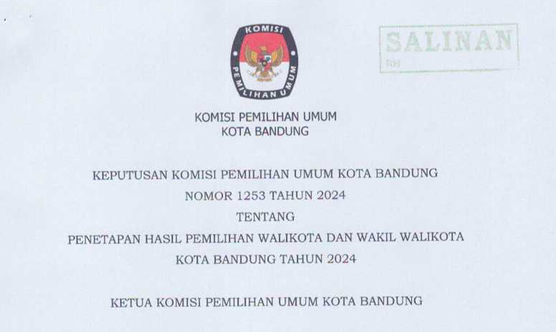 Komisi Pemilihan Umum Kota Bandung dengan ini mengumumkan bahwa hasil Pemilihan Wali Kota dan Wakil Wali Kota Bandung Tahun 2024 telah resmi ditetapkan. Keputusan ini berdasarkan Keputusan KPU Kota Bandung Nomor 1253 Tahun 2024, yang menetapkan pasangan calon terpilih sebagai Wali Kota dan Wakil Wali Kota Bandung.
