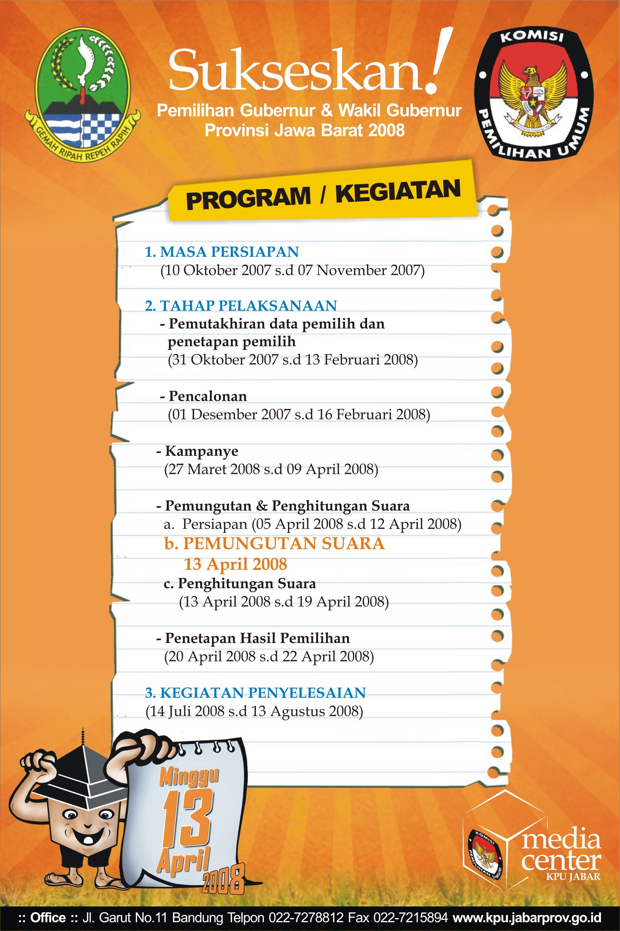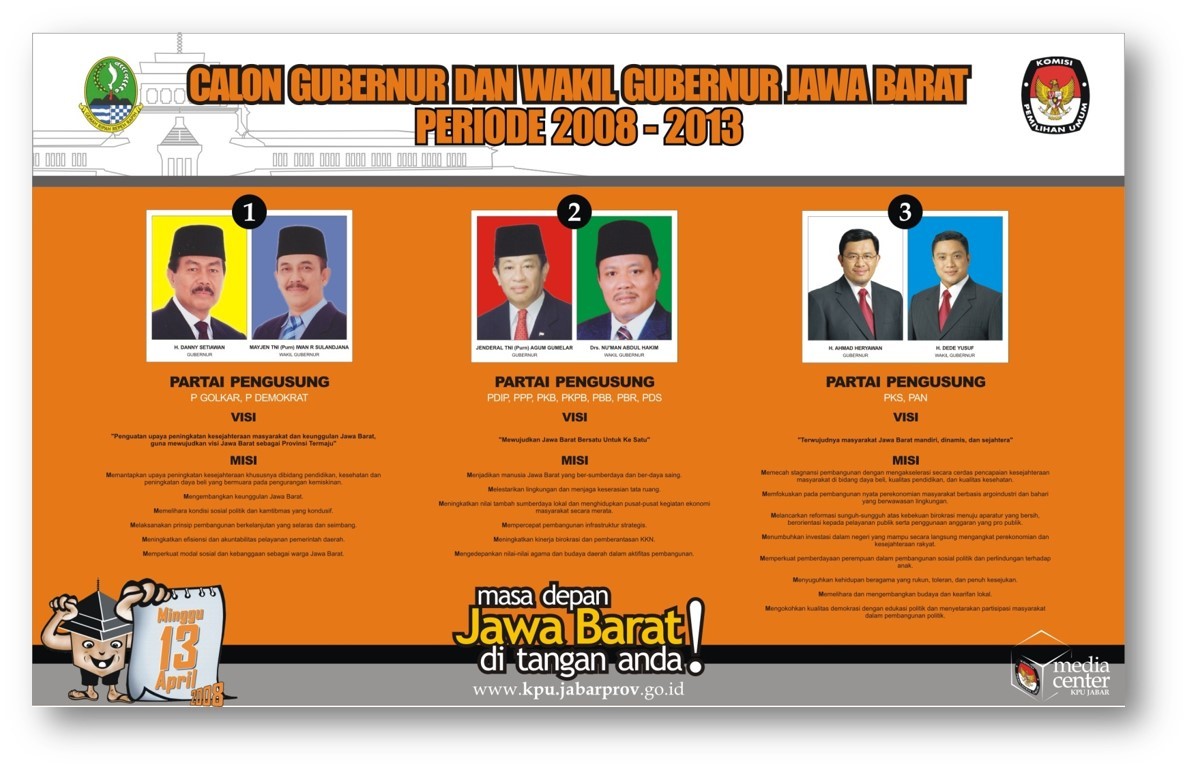 Data - Data Pemilihan Gubernur dan Wakil Gubernur Jawa Barat Tahun 2008 Tahapan Pemilihan Gubernur dan Wakil Gubernur Jawa Barat Tahun 2008 Daftar Pemilihan Tetap (DPT) Pemilu Gubernur dan Wakil Gubernur Jawa Barat Tahun 2008 Pasangan Calon pada Pemilihan Gubernur dan Wakil Gubernur Jawa Barat Tahun 2008 Rekapitulasi Hasil Penghitungan Suara Pemilihan Gubernur dan Wakil Gubernur Jawa Barat Tahun 2008 Tingkat Kota Bandung Bagikan : Dilihat 658 Kali.